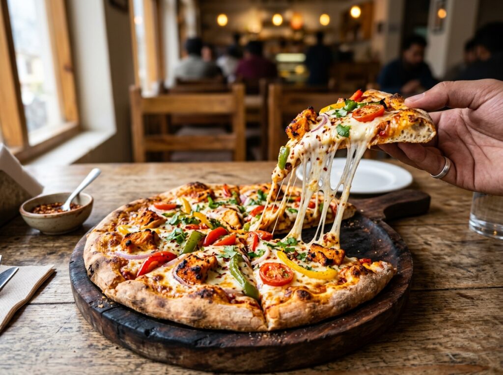 Can’t decide? Get everything. This is the “Works” pizza. It combines chicken tikka, beef pepperoni, mushrooms, olives, and veggies all on one giant platter. It is the perfect centerpiece for a family dinner or a birthday party.